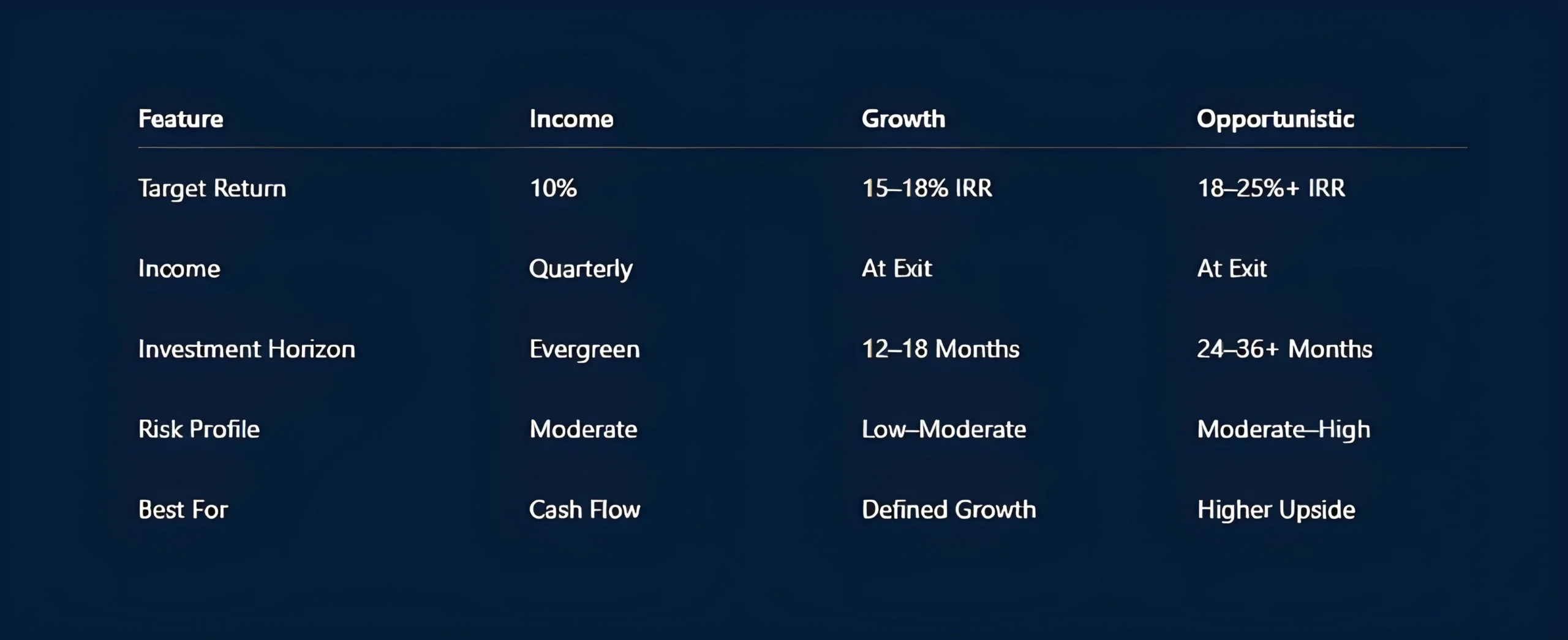Each Countrywide Capital fund is designed with a distinct investment objective, return profile, and time horizon to help investors align their capital with their financial goals. Whether you’re seeking predictable quarterly income, structured capital appreciation, or higher-upside real estate opportunities, our strategies offer diversified, asset-backed exposure across multiple risk levels and investment cycles.